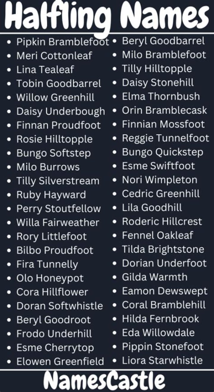 In the realm of Dungeons & Dragons, Halflings are known for their strong sense of community and belonging. This is reflected in their naming conventions, which often include common surnames that are passed down through generations. Names like "Took" and "Brandybuck" are two examples of common Halfling surnames.