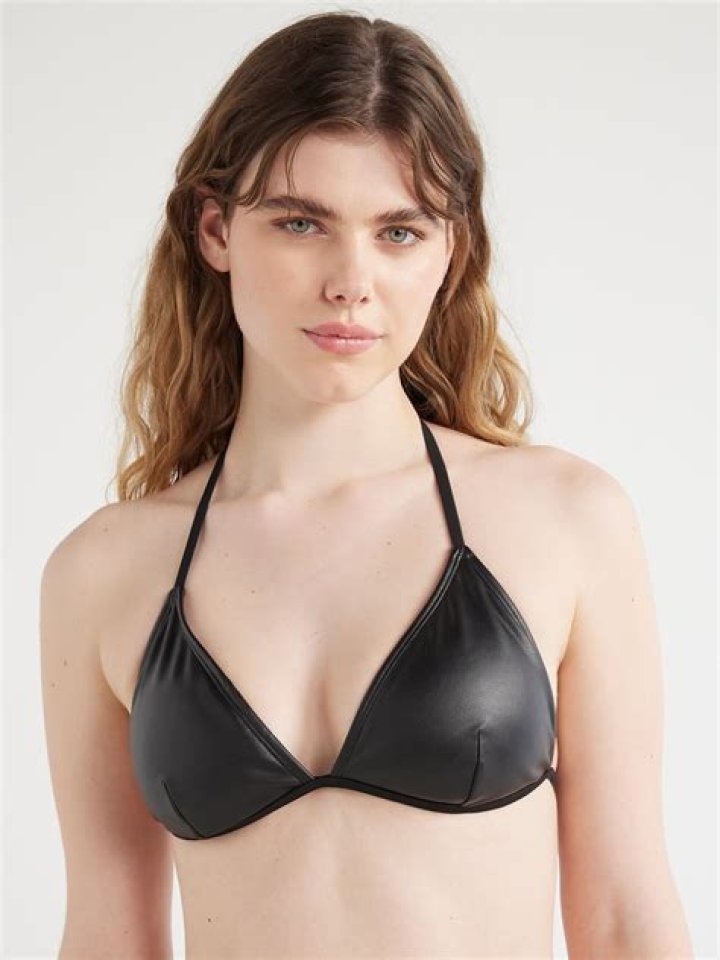 A black leather bikini top is a type of swimwear that is typically worn by women. It is made of black leather and covers the breasts, leaving the stomach and back exposed. The shoulder straps are adjustable to ensure a comfortable fit.