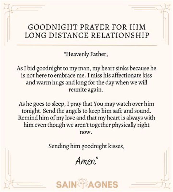 Answer: A good morning prayer for him long distance can include expressions of love, gratitude, concern, protection, guidance, and well-being. It is a personal and heartfelt message that can be tailored to the specific needs and circumstances of the loved one.