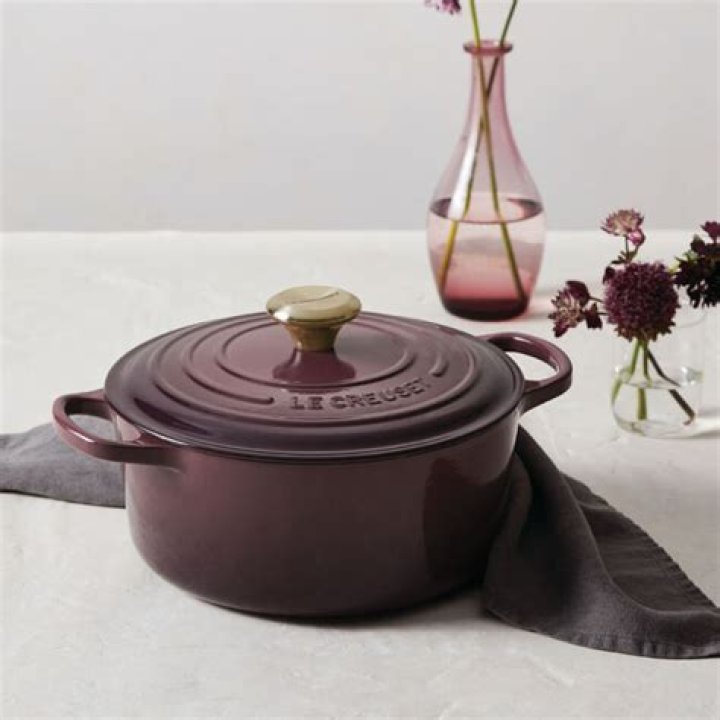 Le Creuset Fig Dutch Oven: A high-quality enameled cast iron Dutch oven in a vibrant fig color.
