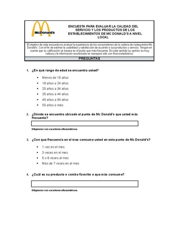 Question 1: What is the purpose of the encuesta de McDonald's?The encuesta de McDonald's is a survey that is used by McDonald's to gather feedback from customers about their dining experience. The feedback from the survey is used by McDonald's to improve its operations and develop new products and services.