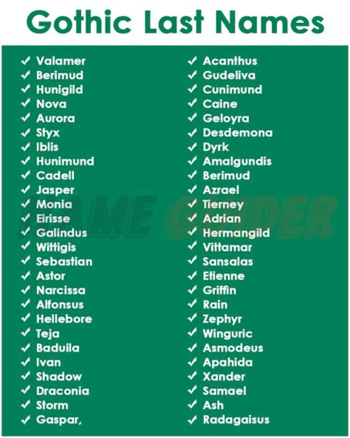 Definition: Gothic last names are surnames that originated from the Germanic tribes known as the Goths. They are characterized by their often dark, mysterious, and evocative sound. Some common examples of Gothic last names include: