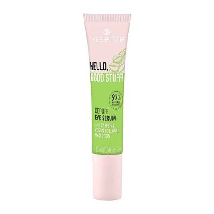 Essence Hello Good Stuff De-Puff Eye Serum is a lightweight, fragrance-free formula that is specifically designed to reduce the appearance of fine lines around the eyes. It contains a blend of ingredients that work together to improve the skin's elasticity and firmness, resulting in a smoother and more youthful appearance. Key ingredients include: